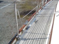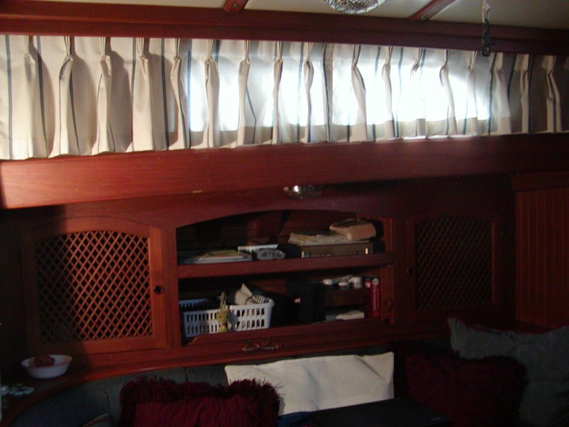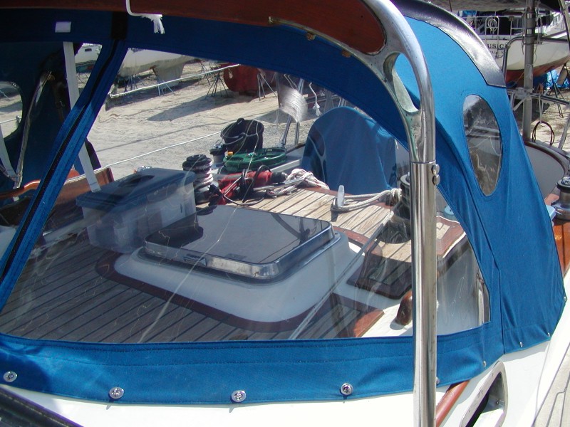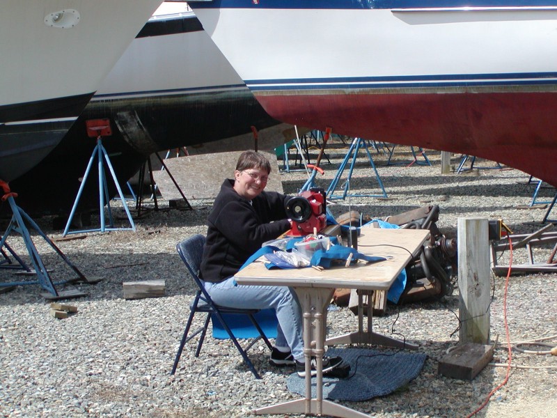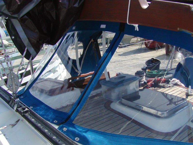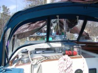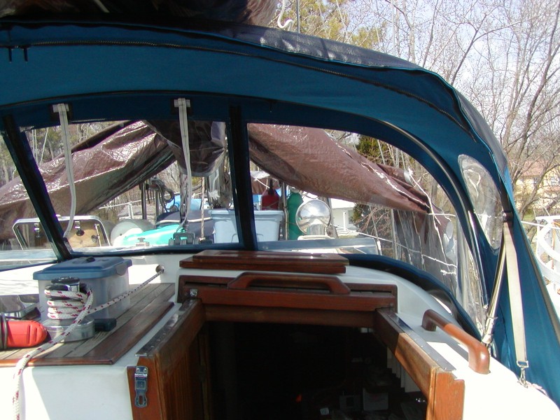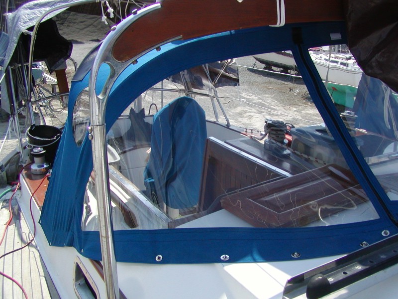 After our first attempt at fitting the new dodger on, John cut off an inch of the aft bow on each side which allowed us to get it snapped down to the boat. John put new "common sense" turn button fasteners on the boat and then added the grommets and snaps to the dodger. It fits tightly, which is what it's supposed to do. It will be nice having windows we can SEE through!
